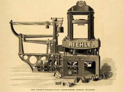 在中國,杠桿式拉伸試驗(yàn)機(jī)被引進(jìn)大概是在上世紀(jì)初,同濟(jì)大學(xué)建設(shè)初期,引進(jìn)一臺(tái)同濟(jì)編號(hào)為:440001的杠桿式拉伸試驗(yàn)機(jī)(圖二),目前,存放于同濟(jì)大學(xué)力學(xué)試驗(yàn)中心。這臺(tái)試驗(yàn)機(jī)上同時(shí)標(biāo)有“RIEHLE BRCXPHILA16494”(圖三)的小字,通過檢索,發(fā)現(xiàn)這臺(tái)試驗(yàn)機(jī)是由位于美國費(fèi)城的理勒兄弟測(cè)試機(jī)械公司(Riehle Brothers Testing machines Company)生產(chǎn)。